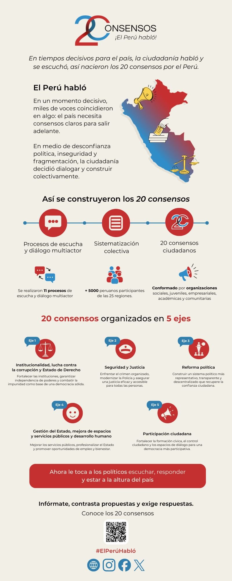 A través de encuentros presenciales, consultas y espacios de deliberación, se identificaron prioridades comunes y demandas compartidas. De esa experiencia colectiva surgieron 20 consensos que expresan lo que la ciudadanía considera indispensable para el futuro del país.